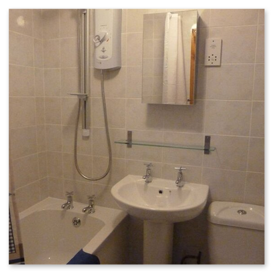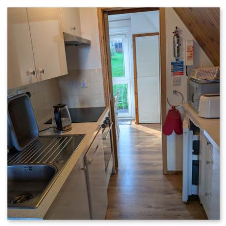 The timed hot water switch for the kitchen and bathroom is above the cooker hob. Water for the shower and basin in the the upstairs toilet water is heated separately.